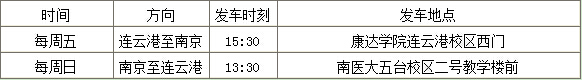各位老师: 根据大部分老师的建议,后勤办决定自12月起,连云港至南京的班车发车时间地点不变;南京至连云港的班车上车地点不变,发车时间提前至13:30,12月5日正式执行下表乘车时间,后勤办将会根据季节变换,对班车时间作出适当调整,届时发布通知,请大家注意学院网站通知公告。